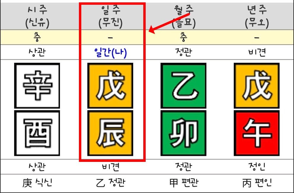 - 오른쪽 두 번째 한자 = ‘일간(日干)’ = 당신의 일주